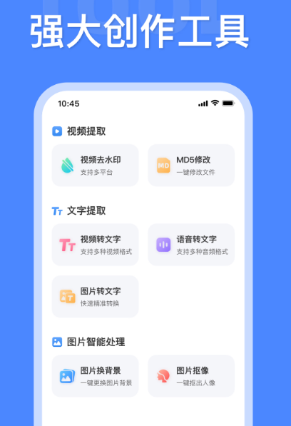 很多人在制作视频或者是编辑视频的时候,都会通过该软件来搜索高效的素材内容,只需一键就能获取上万款素材,各种风格素材应有尽有。用户不管是喜欢哪一种都能轻松获得软件,还具有便捷的创作工具,还有视频去水印、视频转文字、语音转文字等,让每个用户在创作的时候变得更简单高效。