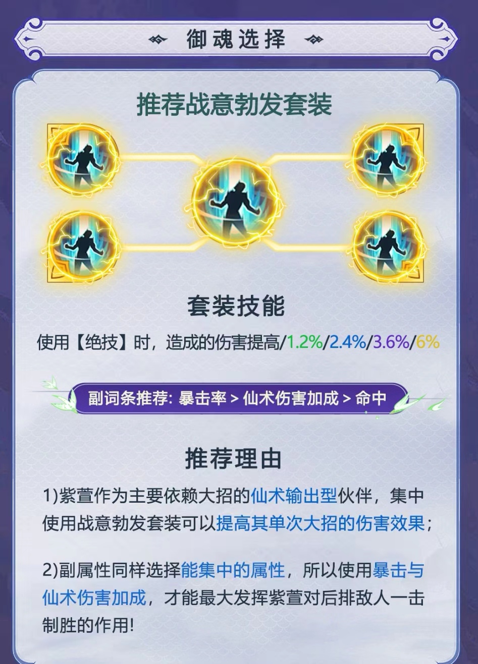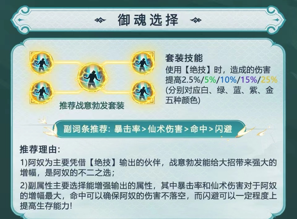 首先要知道游戏当中御魂的选择其实是多种多样的,这是因为游戏里面的定位角色的各种不同属性而特别设置的,让玩家们更好各方面的理解,其实可以根据角色的不同将它们大致分为输出型和辅助型的搭配角色,首先为大家讲解一下比较喜欢输出型角色适合搭配的御魂套装有哪些,在这里推荐玩家们选择战意勃发套装,战意勃发主要就是增加一个暴击的输出伤害,比较适合容易打出暴击的角色,例如阿奴和紫萱,装备上这样的话暴击率得到很大提高,输出能力的伤害也就会更高一些,同时暴击伤害也会得到更大的提高,它几乎适配于所有打暴击型输出的角色。