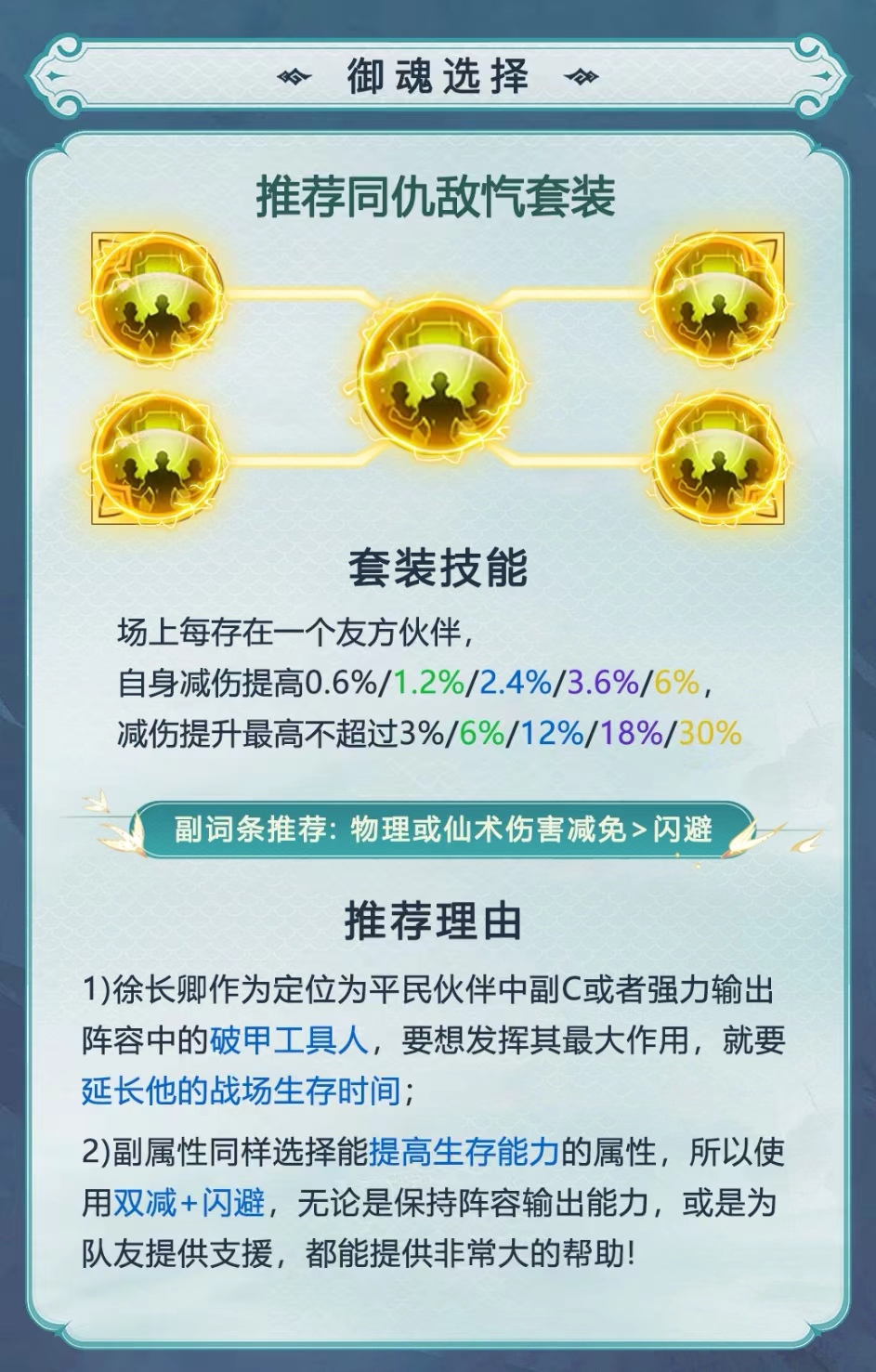 再来为大家推荐一下辅助型角色会更喜欢的御魂套装,这里为大家推荐的就是同仇敌忾套装,这个套装主要是增加角色的生存能力,这个东西可以帮助玩家们在游戏当中更好的生存下去同时也会让角色的续航能力得到大大提高,非常适合像徐长卿一样的副c角色,可以让其作为队伍中的破甲,不仅能为自己减伤,对于自己这方的伙伴还能迅速支援,也是一个不错值得选择的存在,主要就是在延长角色生存时间上非常靠谱。