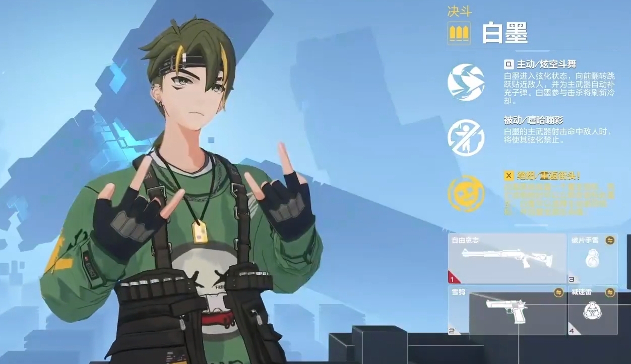 白墨:这是很厉害的一个决斗角色,玩起来难度也不高,主动就是向前跳跃翻转并补充自己子弹,对于经常会不小心打空自己弹夹的新手玩家来说非常有用,而且它可以通过击杀敌人来刷新,因此冷却时间的问题也不用担心。