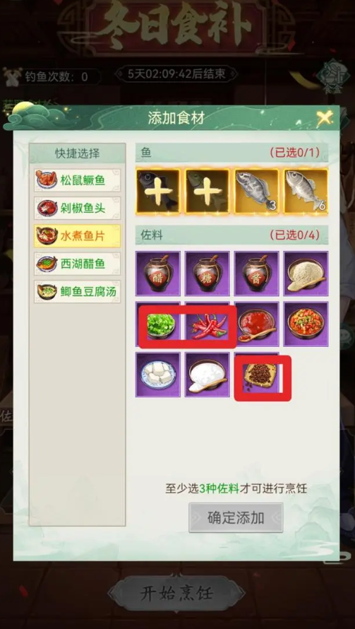 首先第一道菜是水煮鱼,它的配料需要用到辣椒,花椒和葱花。玩家们将鱼烹饪好后,再加上这些佐料就可以完成了。完成该道菜,系统会赠送给玩家龙葵,林月如,紫萱,酒剑仙,李忆如,盖罗娇等英雄。