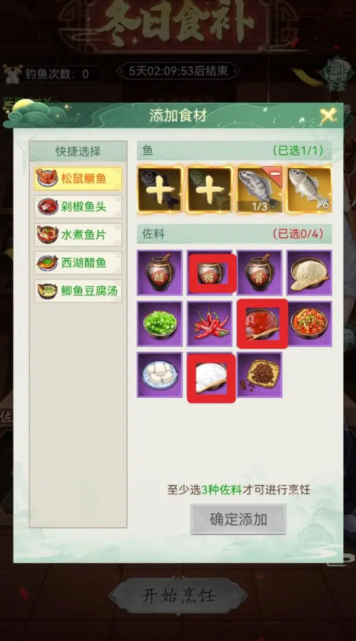 第四道菜是松鼠鳜鱼。玩家只需要在烧好的鱼上挤上番茄酱,撒上糖和淀粉即可。完成这道菜后会被赠送独孤剑圣,拜月教主,景天,林天南,唐钰,花楹等角色。做一道菜是剁椒鱼头,玩家需要用到一条鱼的鱼头,然后撒上剁椒和胡椒粉,葱花即可。完成这道餐后会赠送给玩家唐雪见,苏媚,徐长卿,阿奴,星璇,夙玉,镇狱明王,天灵皇等角色。要注意的是,某些菜品需要多条鱼才才能成功,如果玩家第一次没有成功可以多选几条鱼进行尝试。