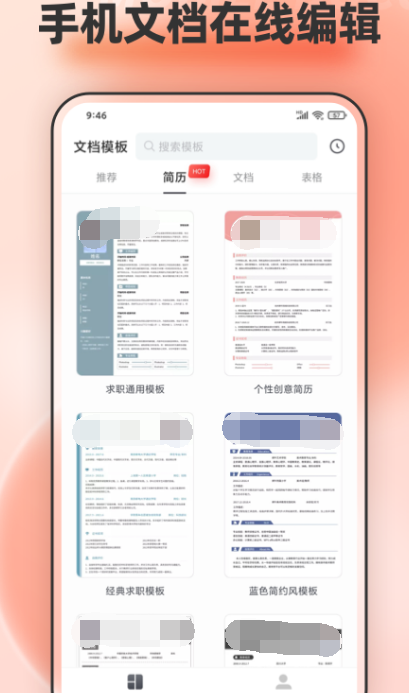在这一个软件里,它支持手机文档在线编辑的功能,包括pdf编辑,还有海量的模板可一键切换,比如在制作个人简历的时候,就能轻松添加个人信息,可自由的切换简历模板,让每个人在求职路上都能轻松制作精美简历,还具有文档模板分享、导出等实用功能。