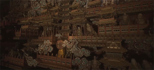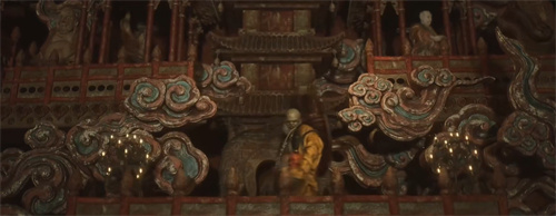 他的人种袋也不再是一个普通的口袋,而是一个精美的装饰品,上面有绿松石、珊瑚、金银绣的佛像,还有十一面观音的流苏。他的武器也不再是狼牙棒,而是一根金色的法杖,上面有一个镂空的球形装饰,里面有一个卍字的图案。