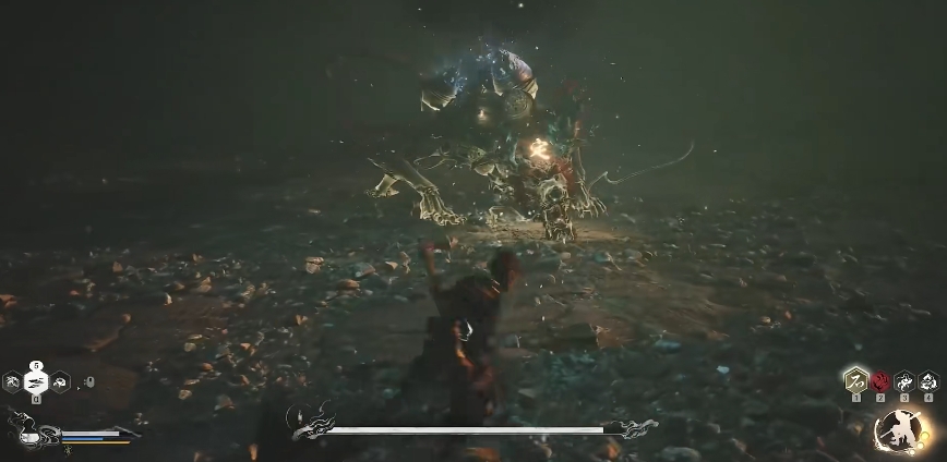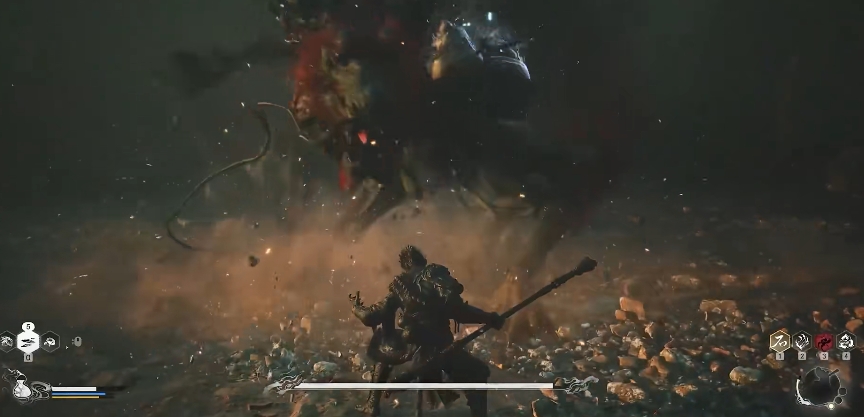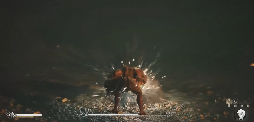 此外,这招还可以让你在击败部分特定敌人后获取它的形态,之后通过使用变身术即可让你变成他的样子,同时还会获取他的武器以及技能,这在实机画面中击败刀狼教头后就有过体现,变身后,包括其外形,武器乃至武器的特性都全盘给复制了过来。