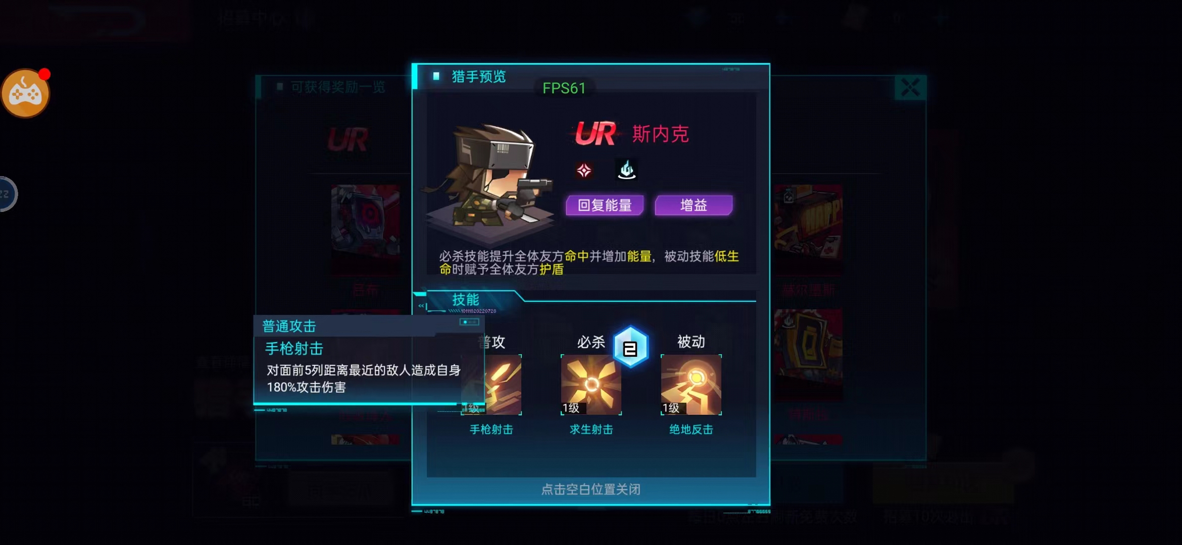 斯内克:它是一个自身就带有一定增益效果的角色,释放手枪攻击的时候可以对面前5列距离最近的敌人造成自身180%攻击伤害,必杀技可以对距离最近的8名敌人造成220%攻击伤害,同时增加全体友方20%命中,这样的效果一样是持续10秒时间之后再增加3点能量,而被动技能则是一个反击的技能,可以在自身生命首次低于50%时,赋予全体友方自身200%攻击的护盾,这个护盾也是可以持续十秒时间的。