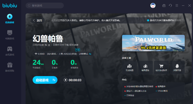 如果在操作的时候出现卡顿的现象,可以选择下载加速器。biubiu现在针对幻兽帕鲁游戏玩家会推出加速的活动,新用户在注册之后就可以得到24小时加速时长,另外再搭配biubiu就可以有机会得到三天的免费加速时长,总共是96个小时,其实新老用户全部都可以使用这一个兑换码。