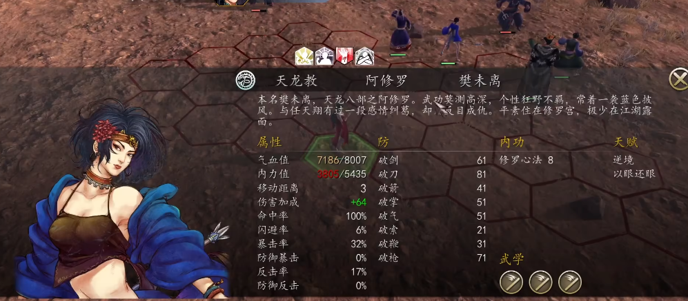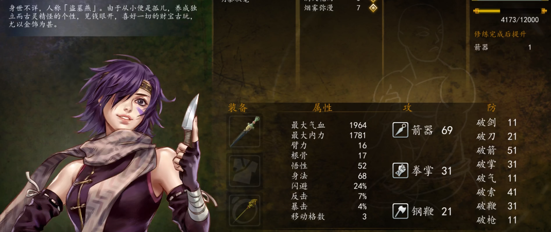 史燕的作用是可以帮助玩家偷窃一些物品和秘籍,她有一个专属的武功,叫做荆轲武诀,可以让她在战斗中偷取敌人的物品,有时候可以得到一些稀有的物品,比如武功秘籍、装备、药品等。史燕还有一个专属的天赋,叫做盗贼之王,可以让她在大地图上偷取一些物品,有时候可以得到一些有用的物品,比如金钱、食物、材料等。史燕的偷窃能力是游戏中最强的,可以让玩家省下不少的金钱和时间,获取一些难以获得的物品和秘籍。