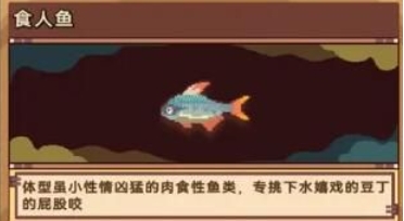食人鱼:是外形看起来比较娇小,但是实际性格非常凶猛的鱼类,会在有豆丁下水的时候去追着豆丁妖,身体颜色比较多,长度不算长,但是牙齿锋利,豆丁下水嬉戏的时候要多注意。
