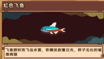 虹色飞鱼:顾名思义是一种会飞起来的鱼类,这类鱼会从水底窜出来跳成一道彩虹的弧线然后落入水中,因为身体的颜色比较多,看起来就像彩虹一样,跳起来还可以反射出日光的光线,身体长度也比上面的两类鱼长。