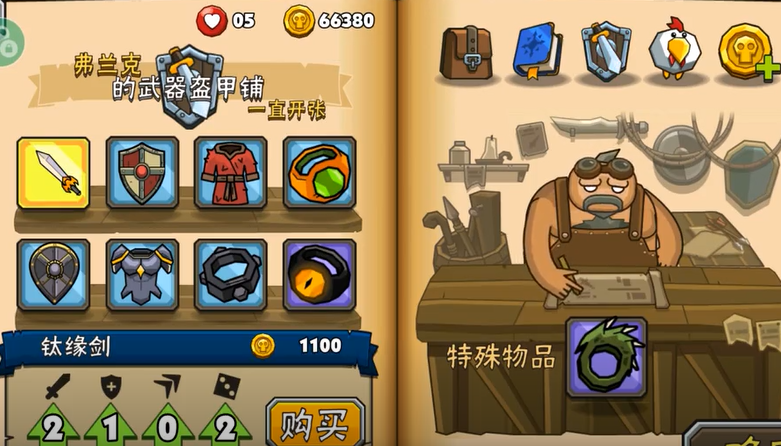 虽然游戏中的技能只有2个,但是通过这些简单的技能搭配上很灵性的跳跃,就可以在战斗中,打出非常亮眼的操作,在通关后,通常是会获得大量的游戏金币的,大家可以在燃烧村庄中,找到弗兰克,弗兰克开着一家铁匠铺,可以在其手上购买大量的武器和盔甲来强化自己!