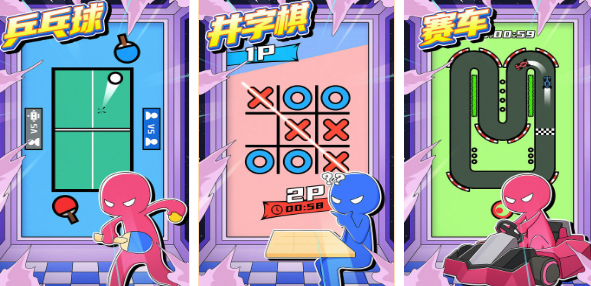 这款游戏相对于其他游戏来说就是一款非常休闲娱乐的小游戏了,同时也是双人竞技作战的小游戏,在这里可以玩乒乓球也可以玩井字棋也可以玩赛车,游戏模式不同也意味着多种不同挑战,和自己的小伙伴们PK更有乐趣,整个游戏的游戏画面也是比较简洁的,也可以帮助玩家们在放松心情的时候放松眼球。