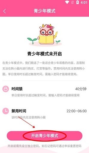 4.点击进入详情页面,确定启用青少年模式即可,开启此模式之后就能限制观看时间段,关闭打赏等等。