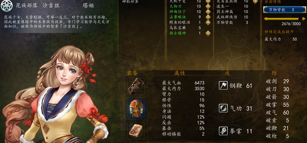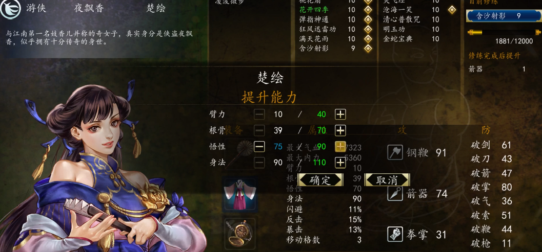傅剑寒的初始武功是东鳞西爪剑,这是一个比较平庸的剑法,威力一般,没有什么特殊效果。我们应该尽快给傅剑寒换一个更强的剑法,比如饮中八仙剑、天外飞仙剑、迅雷剑法等。这些剑法都有自己的优点,饮中八仙剑可以霸体,天外飞仙剑可以飞行,迅雷剑法可以连击,都可以配合傅剑寒的高敏捷和暴击发挥出强大的效果。另外,傅剑寒还可以学习一些辅助的武功,比如天山幻影剑、龙泣剑法、独孤九剑等,这些武功可以给傅剑寒增加一些特殊的状态,比如重伤、破防、无招等,增加他的战斗变化和威胁。