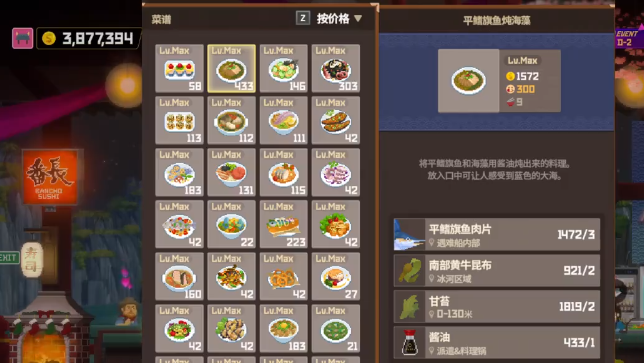 分店中可以出售的食物种类有很多,主要是以寿食为主,比如鹰嘴鱼寿司、虎鲨寿司、海葡萄寿司、巨口鲨寿司,这些寿司类型的食物都可以给玩家带来很不错的收益。