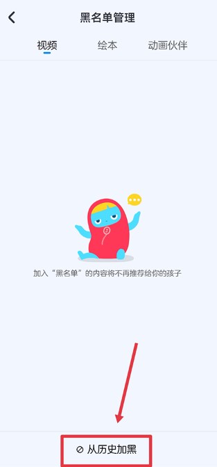 2.在黑名单管理页面中,我们可以看到具体的黑名单列表,包括:视频、绘本、动画伙伴,接着在下方点击【从历史加黑】;