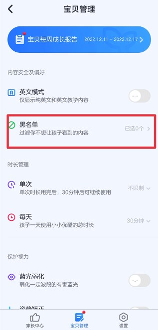 1.在首先点击【家长】按钮,接着在家长中心下方选择【宝贝管理】,然后再选择【黑名单】功能;