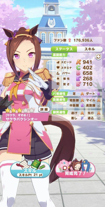 成田大进是一个速度型的角色,因此在比赛前,速度一定达到1100,体力最少为750,才可以取胜,当然,体力越高,持久力就越高,等到后期冲刺的时候才能获得胜利!相比其他比赛,成田大进在追马环境中比较容易获胜,且目前所有人物中只有成田大进有这个技能,最重要的是触发非常容易,是一个独一无二的人物,建议所有玩家都着重培养。