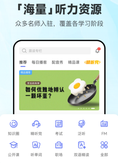 专为英语学者所打造,根据个人英语学习水平,推荐出适合有趣的内容,有超多四六级资料,支持单句精听、跟读打分等超多训练模式,每天坚持10分钟,轻松提高英语听力水平。