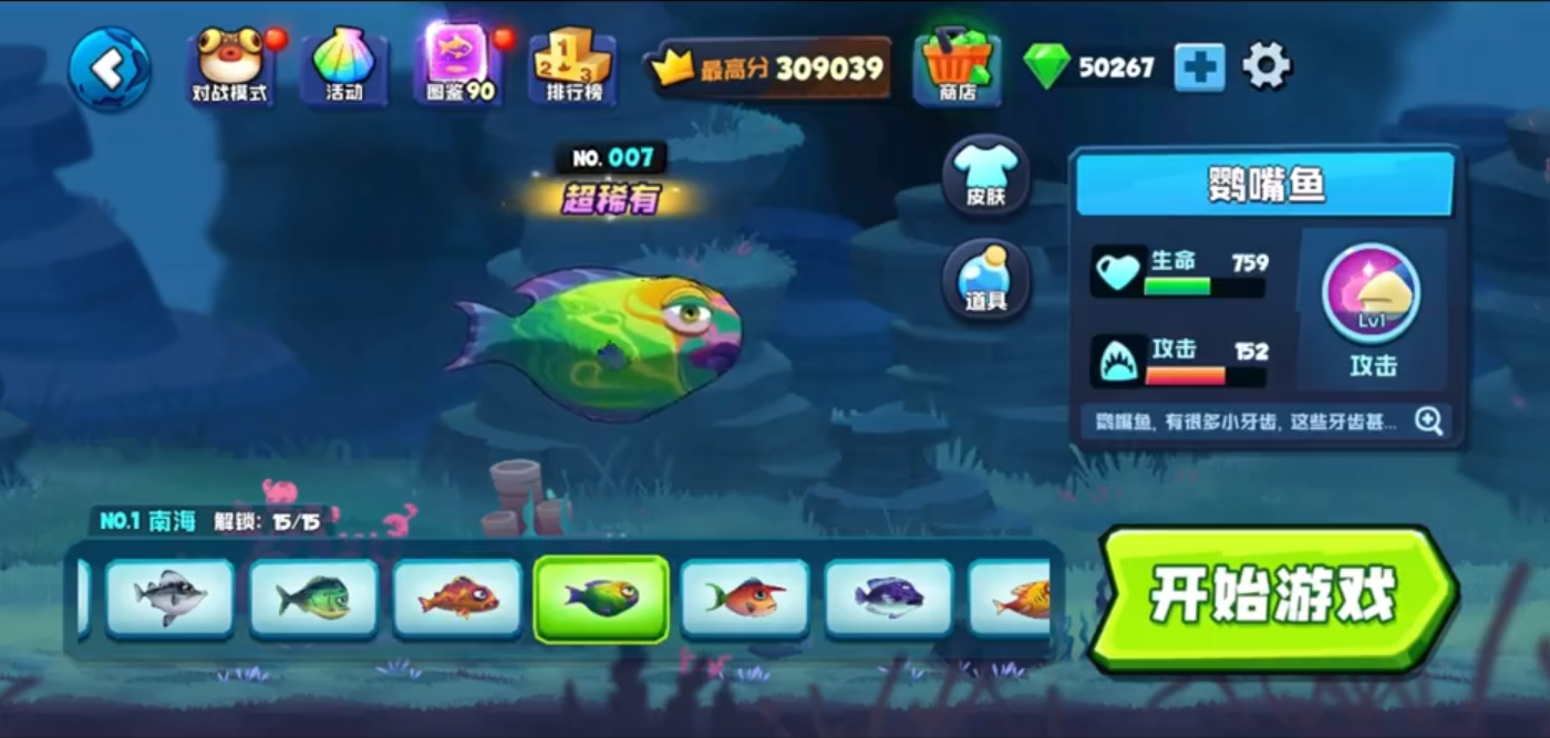 在第一海域南海中,鹦嘴鱼是难得的强力攻击鱼种,解锁该鱼种的方式也是非常简单的,着急解锁12条鱼开启下一个新海域的小伙伴们可以闭眼冲一波该鱼种。以上就是有关于鱼吃鱼游戏鹦嘴鱼属性怎么样的全部内容了,我们下期再见。