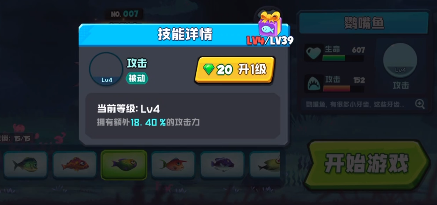 鹦嘴鱼的技能在游戏内也是非常的简单,被动技能在一级的时候可以额外增加18.40%的攻击力,在技能满级之后就可以增加额外48.8%的攻击伤害,配合上它的初始攻击数值152,在技能的加成下,鹦嘴鱼的攻击伤害可以达到226点,与盾皮鱼的伤害属性不相上下。