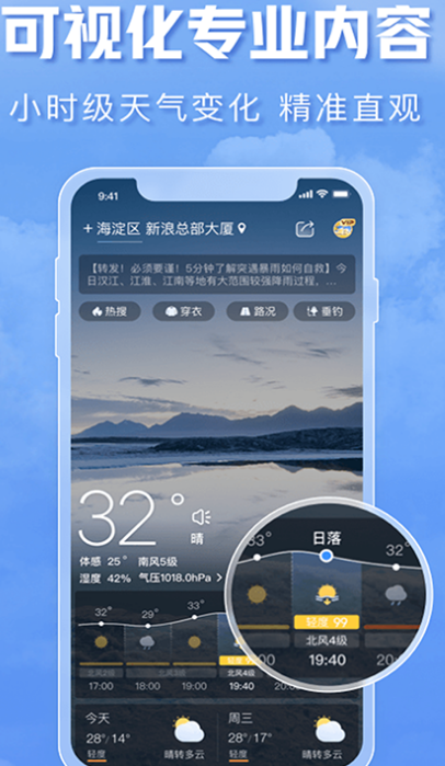 打开app全面又详细的信息,贴心的画面设计,深深的吸引着大家。为用户提供吃穿住行等生活指南。利用核心数据提供预警服务公里及气象预报精准定位,及时推送极端状况。