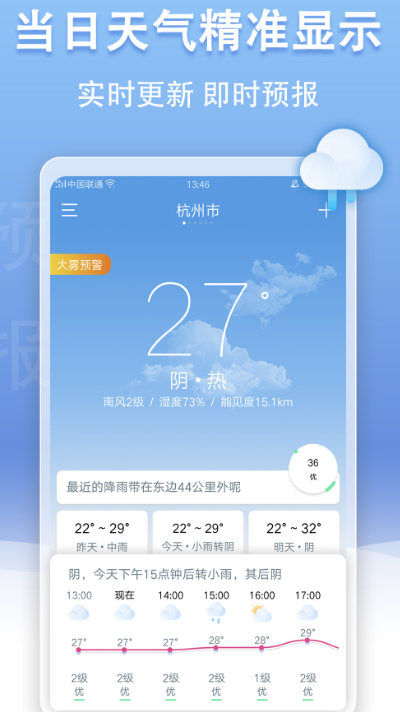 支持全球四万个城市及乡镇天气查询,详细信息全面展示,有空气质量检测,认真呵护你的健康。今天适合穿什么,是否适合外出运动?是否适合洗车?多个生活指数全方位推送。