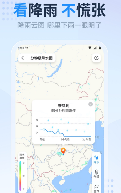 界面简洁明了,占用内存较小,可精准定位调节字体大小,能精确到几分钟下雨或者停雨等多种状态,可查询风向、温度、空气质量,提醒未来两周天气状况。