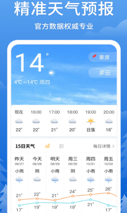 详细的信息即可播报,提供未来40天趋势预报,有温度、能见度、日出日落等,让出行有计划有保障。