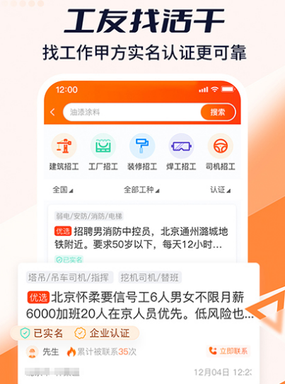 招工、找活、找建材app,老板和工人精准联系,随时随地查看各种相关信息,帮助劳务公司寻找优秀的建筑工人,装修人才等,提高招聘效率。