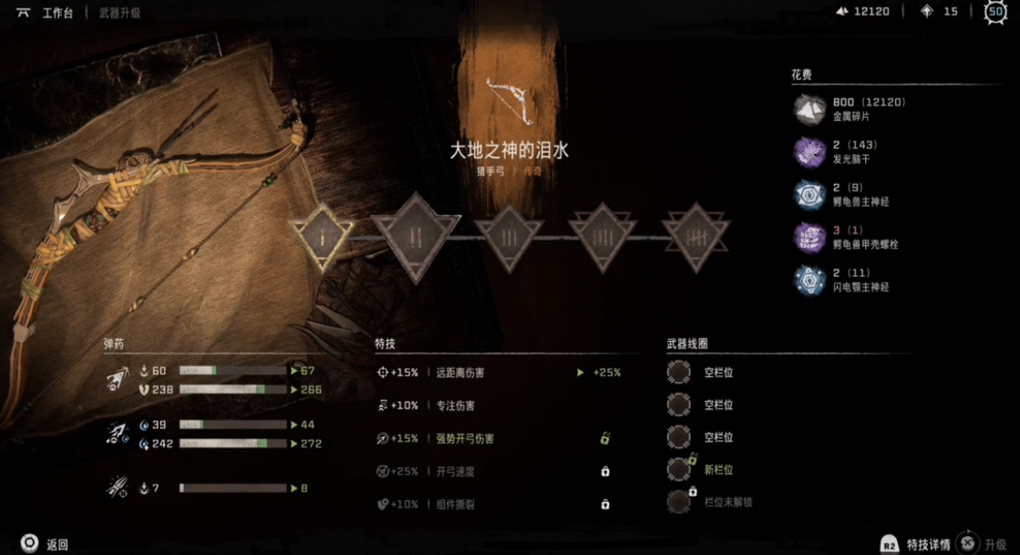 要升级武器的话,先需要找到游戏中的工作台。这些工作台通常位于主要的定居点或者营地。一旦找到工作台,点击使用,将进入升级界面。在这里大家直接可以看到所有可升级的武器列表,以及每个武器所需的材料和升级点数。选择你想要升级的武器后,系统会显示所需的资源。这些资源可能包括金属碎片、编织线或其他特定的材料。