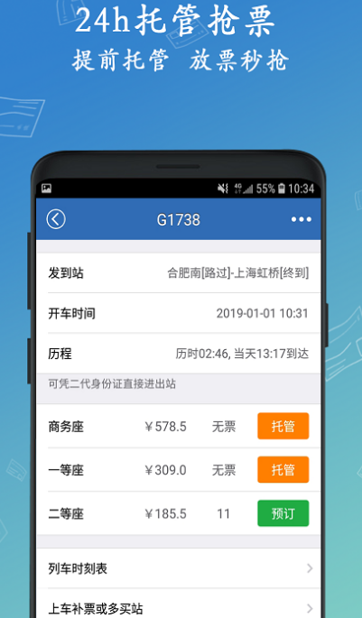 轻松查询火车票的余额,购买时官网指定不含任何手续费,有24小时自动下单功能,如果想要抢票的话,想要抢票可直接开启24小时托管成功,下单之后电话提醒付款。即便出行高峰期,购票时也不会出现卡顿的现象,是值得信赖的出行助手。平台界面流畅干净,无广告体验时极其舒适,即便中老年用户也能轻松使用。