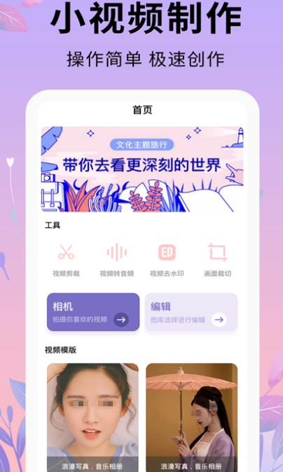 拥有完善的视频编辑工具,还有手机拍摄,视频剪辑,教学专注于特效制作,视频剪辑还能一键去除水印,多功能剪辑工具,让你快速上热门。