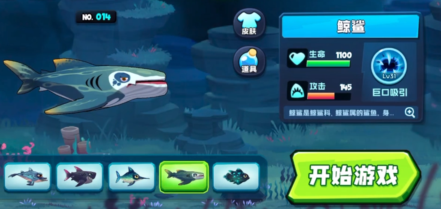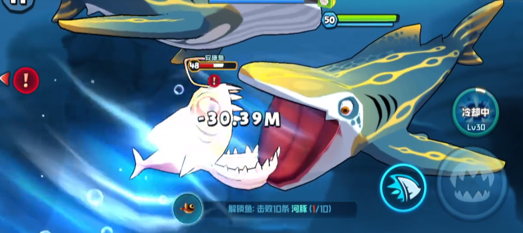 想要快速解锁鲸鲨和大白鲨这一类型的鱼类玩家,在进入游戏之前最好开局选择使用【赤石斑鱼】,在进入游戏之后所有的鱼类想要使用技能都需要达到三级才可以使用,这个时候就可以先将能找到的饼干全部吃掉来进行升级,在技能成功解锁之后就可以利用技能【再生】快速回复状态,这样就可以保证自己的状态和战斗力。