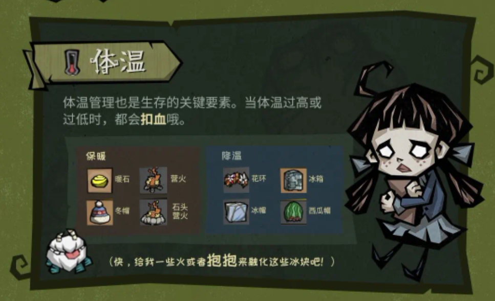 饥饿值就只能通过补充食物来恢复,特别是在探险过程中会快速消耗,新手最好多收集一些大肉丸进行补充。理智值只能通过吃SNA类食物、睡觉和捡花进行恢复,如果不及时恢复就会眼前一黑引来怪物的袭击。潮湿度需要使用防水性质的伞和服饰抵御,如果不防御就会导致体温下降和手滑降低工作效率。体温出现过高或过低都会产生扣血,大家能够使用一些保暖或降温性质的事物进行均衡。