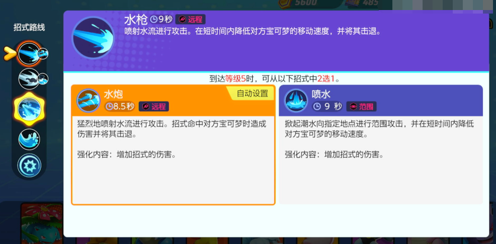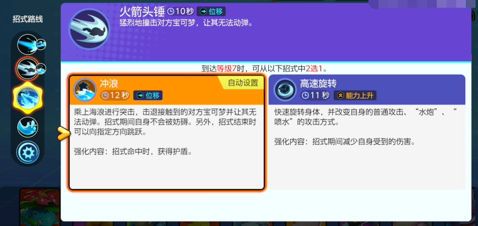 水箭龟的普通攻击在第三次时会触发强化效果,对敌人造成持续伤害并减缓其移动速度。这一点在追击或逃跑时尤为重要,可以有效地控制敌人的位置。水箭龟的技能冲浪能够在不受干扰的情况下移动并击退敌人,这对于防御型宝可梦来说是一个非常有用的技能。它可以与水枪技能结合使用,以支援队友或驱散敌人。而水箭龟的集结招式旋风激流炮是其技能库中的王牌。在旋转的同时喷出水柱,可以退散周围所有敌人,是一个非常关键的团控制技能。