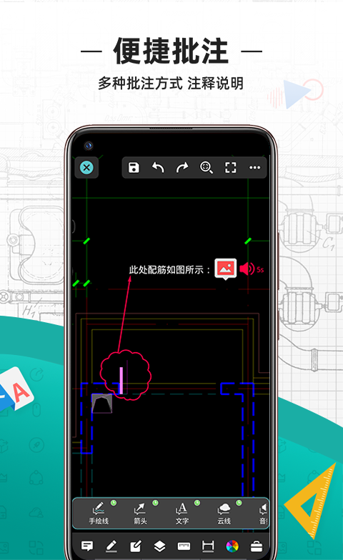 智能快速看图和绘图的软件,手机上的图纸和收藏的图纸都能直接打开,还有大家从其他平台接收到的图纸也可以打开标记,添加一些箭头和文字下一次打开时候能直观的看到。