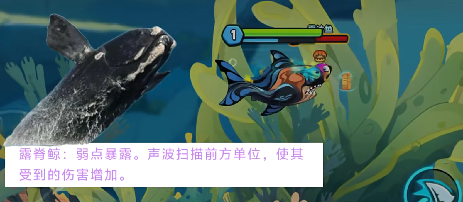 首先第一个就是“露脊鲸”,它在游戏中的形象和现实一样也会是黑白相间的一头鲸鱼,其技能特点与其他鲸鱼也十分相似,也是可以发射声波,不过它的声波偏向于功能性,技能名称“弱电暴露”,使用后会发射一道声波来扫描前方单位,发现它的同事还能增加其所受伤害,无论是后续追击还是配合队友都是非常好用的神技。