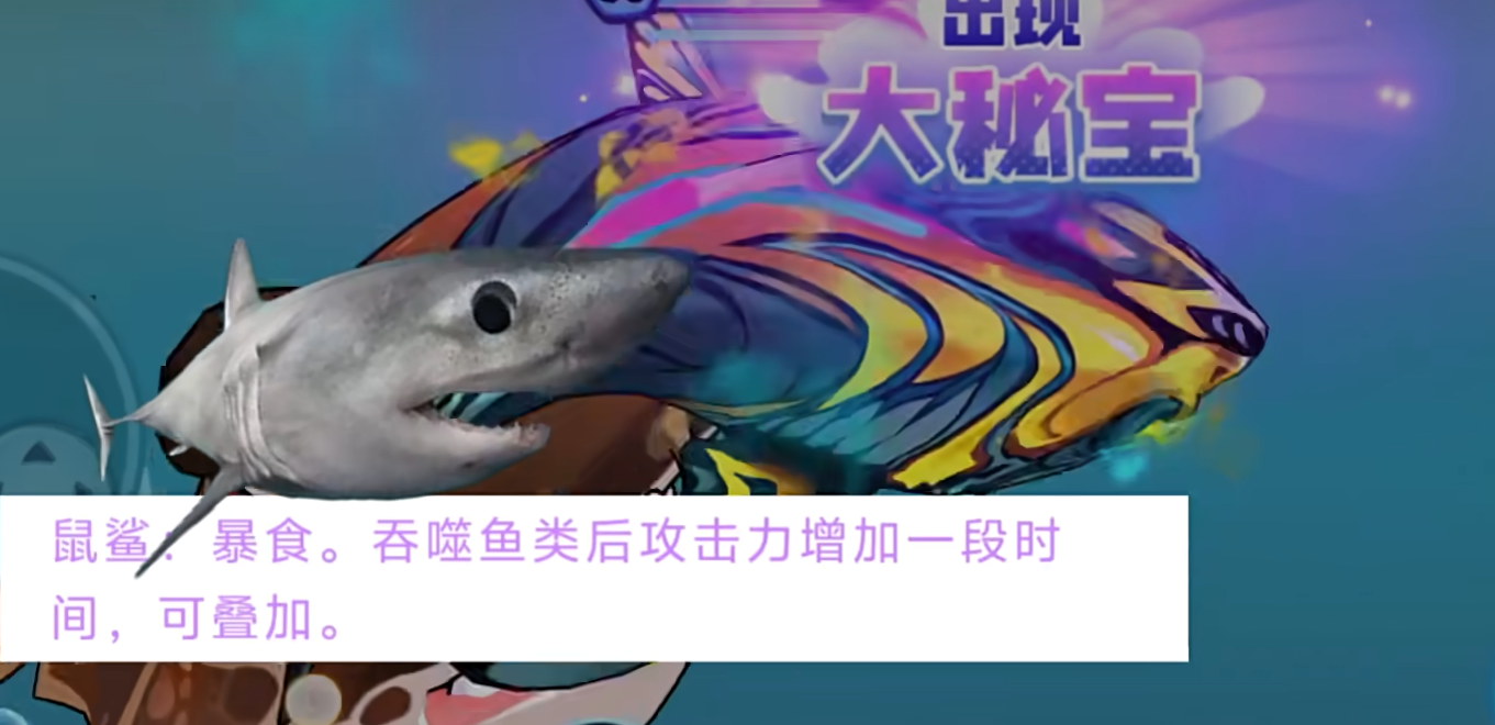 然后第二个是“鼠鲨”,这种鱼它属于典型的进攻型鱼类,与部分鲨鱼的技能也有类似之处,都是一个偏向成长的技能,技能名称“暴食”,本身属于被动触发,效果是吞噬鱼类后自身的攻击会提升一段时间,并且这个攻击它是可以不断叠加的,鲨鱼一般攻击力不会低,所以吃到这个加成后可以最大化的发挥作用。