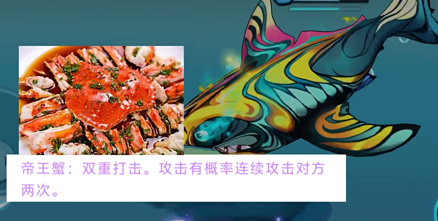 帝王蟹也是第七海洋中比较有代表性的一种鱼类,它的技能是双重打击,这个明显是官方采用了玩家们投稿的创意来进行设计的,该技能的效果是有几率能够连续攻击对方两次,作为被动触发型的技能它肯定是没有冷却时间的,而且一旦触发就相当于那次攻击直接伤害翻倍!