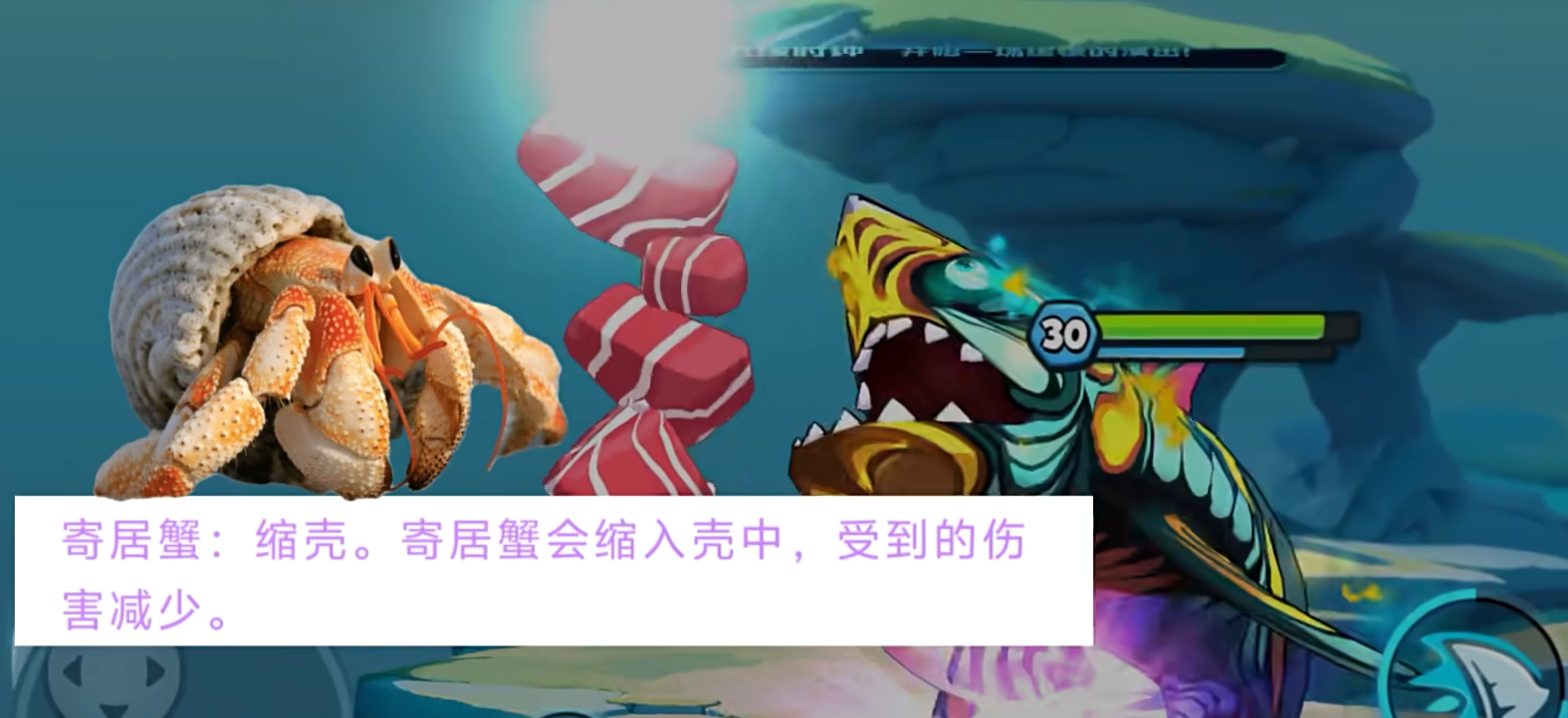 剩下的寄居蟹也是第七海洋独有的一种鱼类,它本身也是偏向苟分的一个鱼类,技能锁壳可以让自己缩进壳中,从而减少所受的伤害,其实这招的效果与部分防守型鱼类比较雷同,唯一区别就是动画不一样。