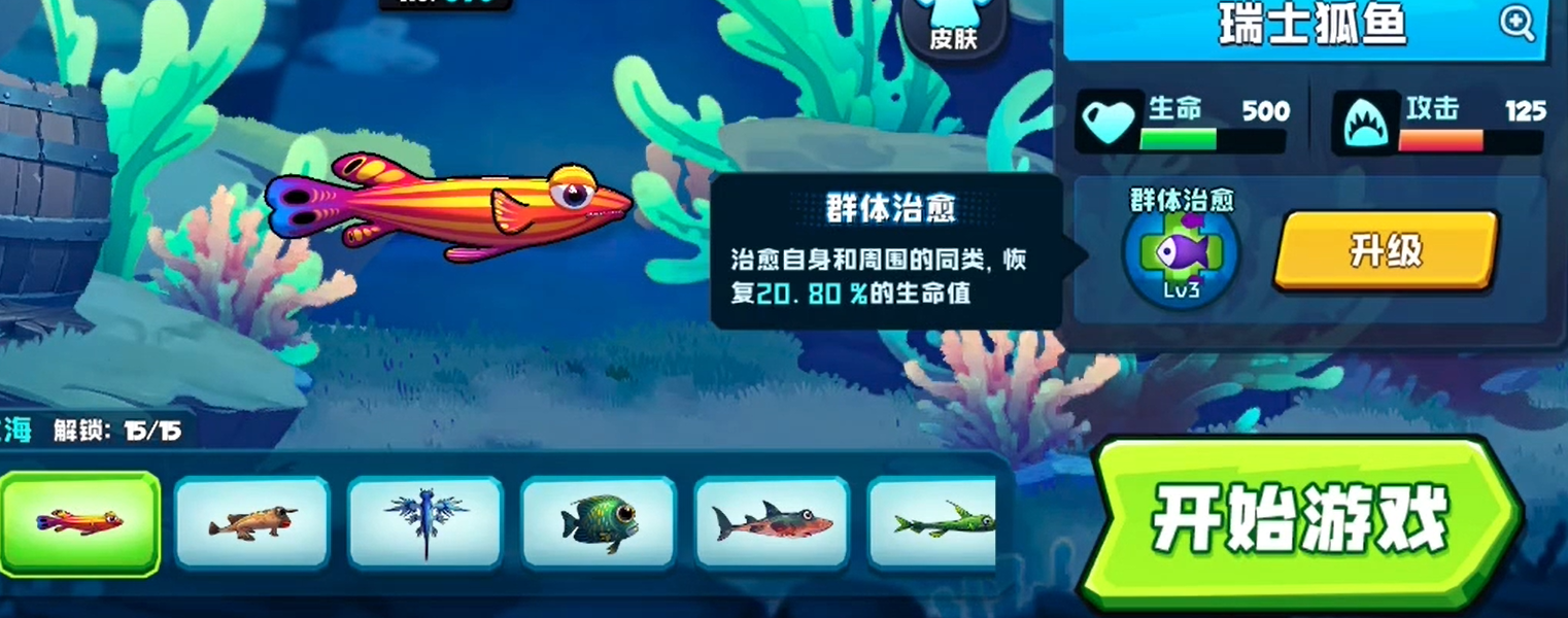 瑞士狐鱼:它是出自加勒比海域的一只常见的鱼类,本身有着500的生命和100出头的攻击,进攻性并不算强,但容错率还算可以,它的最大优势就是技能可以提供群体治愈,因此对于团队的帮助是非常明显的,所以尤为适合与小伙伴一起开黑的时候使用,只要小伙伴玩的和你是同类的鱼,那么都可以享受到它高达20.80%的治愈。