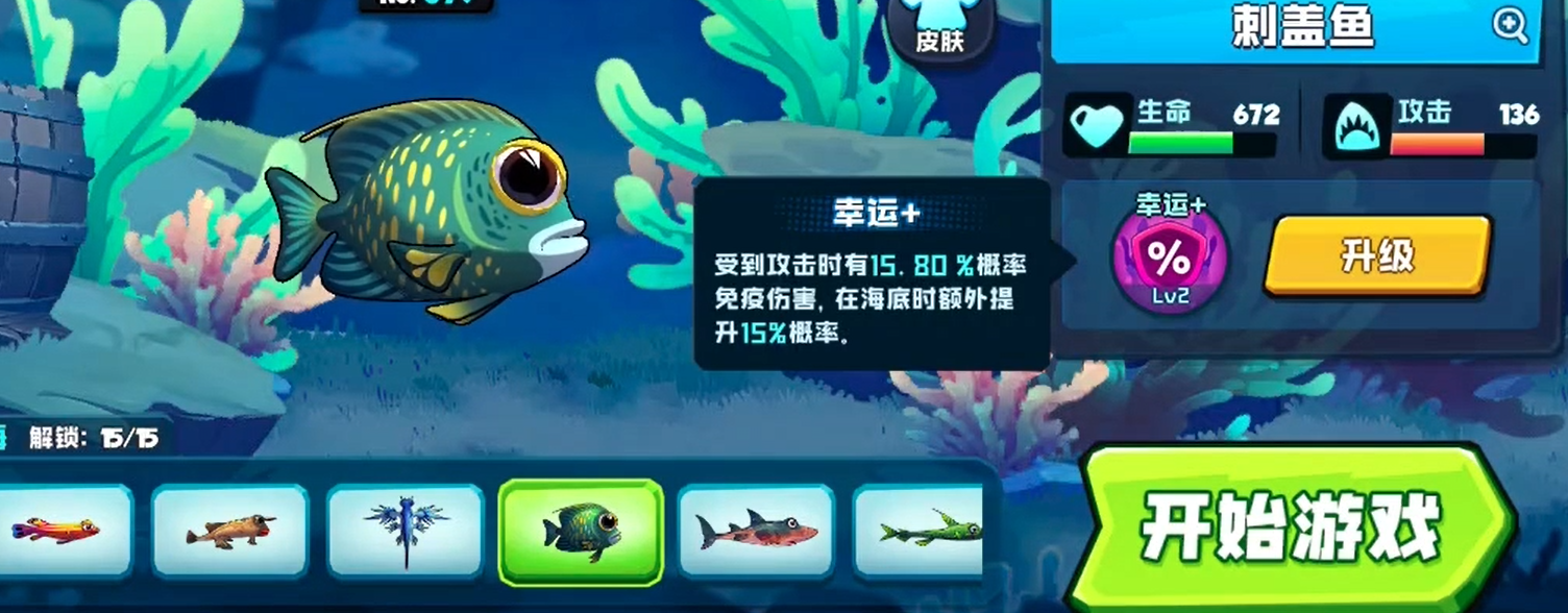 刺盖鱼:这只鱼的生命值还算是比较高的,基础生命就能突破600,升级后坦度又将进一步提升,美中不足就是攻击低了一些,不过考虑到它本身就不算是进攻型的鱼类,因此整体来看还算是瑕不掩瑜的,技能方面,它的幸运 可以在受到攻击时有15.8%的概率免疫伤害,如果是在海底,这个免伤概率还将额外提升15%,因此算是一个容错率非常高的鱼类。