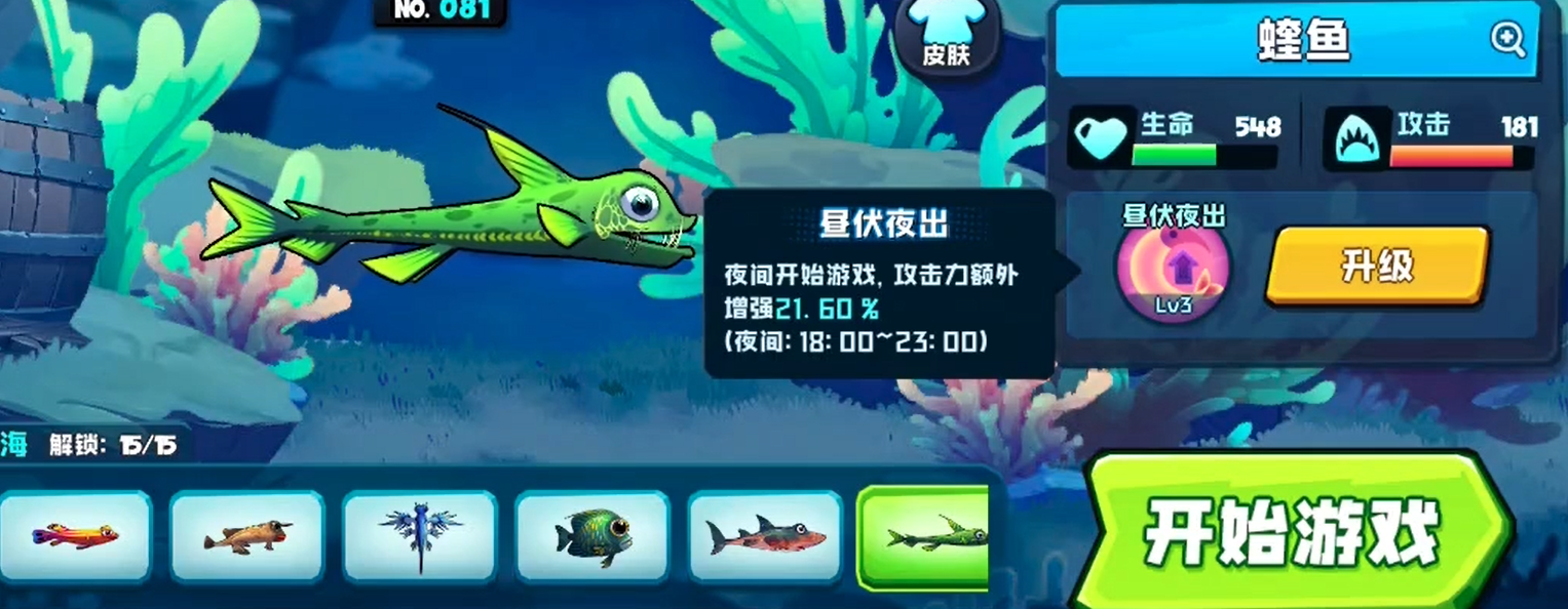 蝰鱼:其基础生命是672,基础攻击为176,属于相当不错的存在,在一般鱼类中,无论攻防都有着不错的优势,它的技能是昼伏夜出,可以在夜间开始游戏时增加额外21.6%的攻击力,所以如果是经常在夜间进行对局的玩家,往往会白嫖到相当丰厚的攻击力加成,对于喜欢进攻的玩家也是很有用的。