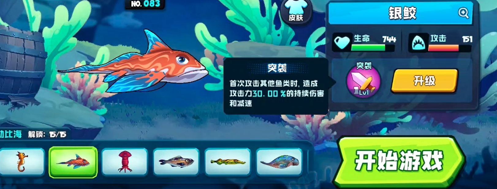 银蛟:这条鱼有着744生命加151攻击的面板,相对来说生命值是比较高的,攻击力的话也算是可圈可点,它的技能也是围绕进攻来量身打造的,在攻击其他鱼类的时候可以造成30%攻击力的额外伤害和减速,无论是用于打持续输出还是用于粘人都非常厉害。