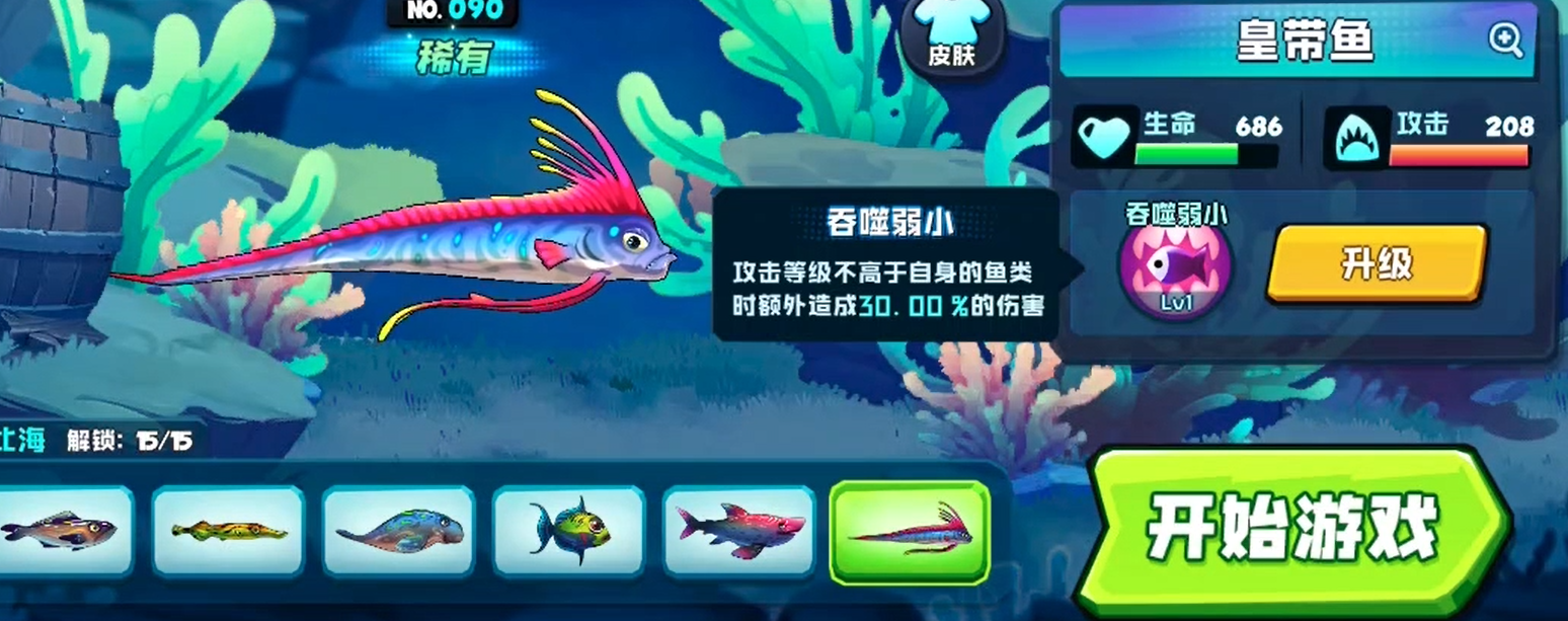 皇带鱼:它是一条典型的进攻型鱼类,品质也是达到了稀有级别。在属性面板上生命只有600多,但攻击直接突破了两百,加上它的培养潜力也很大,所以对于进攻型玩家来说,它是一条不可或缺的强力鱼,它的技能也相当不错,技能名吞噬弱小,在攻击等级低于自身的鱼类时会额外造成30%的伤害,所以玩它的时候先发育后进攻会是一个非常不错的思路,喜欢凌虐低等级对手的朋友会非常适合。