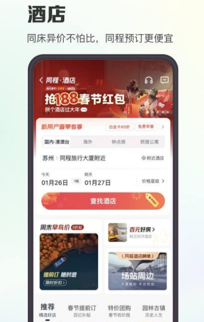 线上预订酒店拥有较多优势,可享受超多折扣,该平台受到几亿用户的认可,随时随地购买机票、火车票、汽车票。还可线上预订酒店,百万酒店覆盖国内外有品牌连锁、民宿、钟点房、亲子差旅旅行,各种场景都能轻松满足,让每位用户享受便捷舒适的旅行服务。