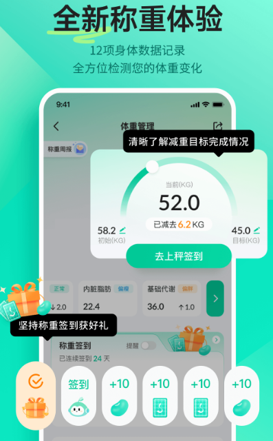 全新科学减脂服务平台推送出科学的解决方案,比如低脂饮食,体质监测等多种系统,现如今全球几百万用户都已下载,并帮助这些人群快速减脂,达到局部瘦身的目的。通过科学的模式进行系统化制定化解决方案,有多维度减脂测评模式,根据身体状况制定减脂计划,每天坚持打卡并记录,长期下去拥有明显效果。