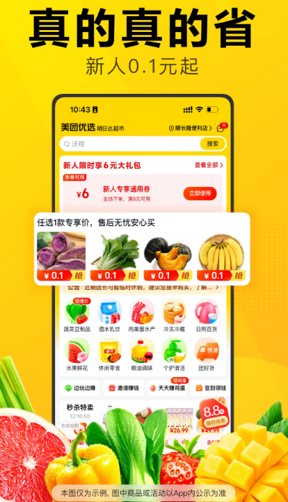 作为很多人都在使用的团购软件,它主要是以生鲜、水果、酒水、饮料为主的,有很多的地方都有专业的美团优选代收点,用户需要在当天23点之前下单,第二天都能够收到商品。不仅很多的产品价格特别的便宜,还有很多使用的产品平台,保证购买的商品没有任何问题,还可享受售后无忧的服务,不管是买水果还是买其他的产品,应有尽有。