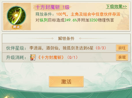 而【天女散花】的话,获得的难度就比较高了,需要阿奴和李逍遥都解锁到四星后,在从主线场景宝箱中获得!【十方封魔斩】则是需要玩家们在游戏中收集酒剑仙和独孤剑圣,并且伙伴达到6星后,才可以解锁使用!